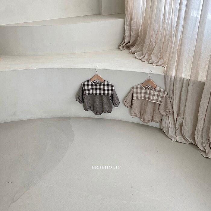 【即納】Bebeholic 2022aw ギンガムチェックセーラーロンパース カラー/グレー/ベージュ サイズ/着丈/身幅/袖丈 M(70)/40/32/22